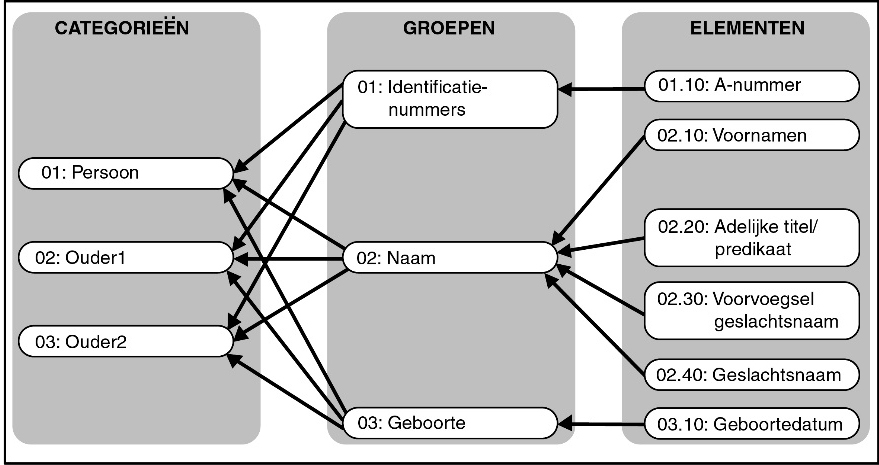 Ten behoeve van de overzichtelijkheid zijn gegevens die een sterke onderlinge samenhang vertonen bijeengebracht in groepen. Een voorbeeld daarvan is de groep 03 Geboorte, die bestaat uit de elementen 03.10 Geboortedatum, 03.20 Geboorteplaats en 03.30 Geboorteland. Een aantal groepen komt in meerdere categorieën voor.